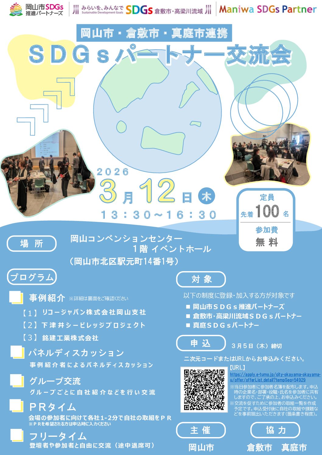 2026年3月12日、岡山コンベンションセンター(岡山市北区)にて開催された「岡山市・倉敷市・真庭市連携 SDGsパートナー交流会」に参加しました。