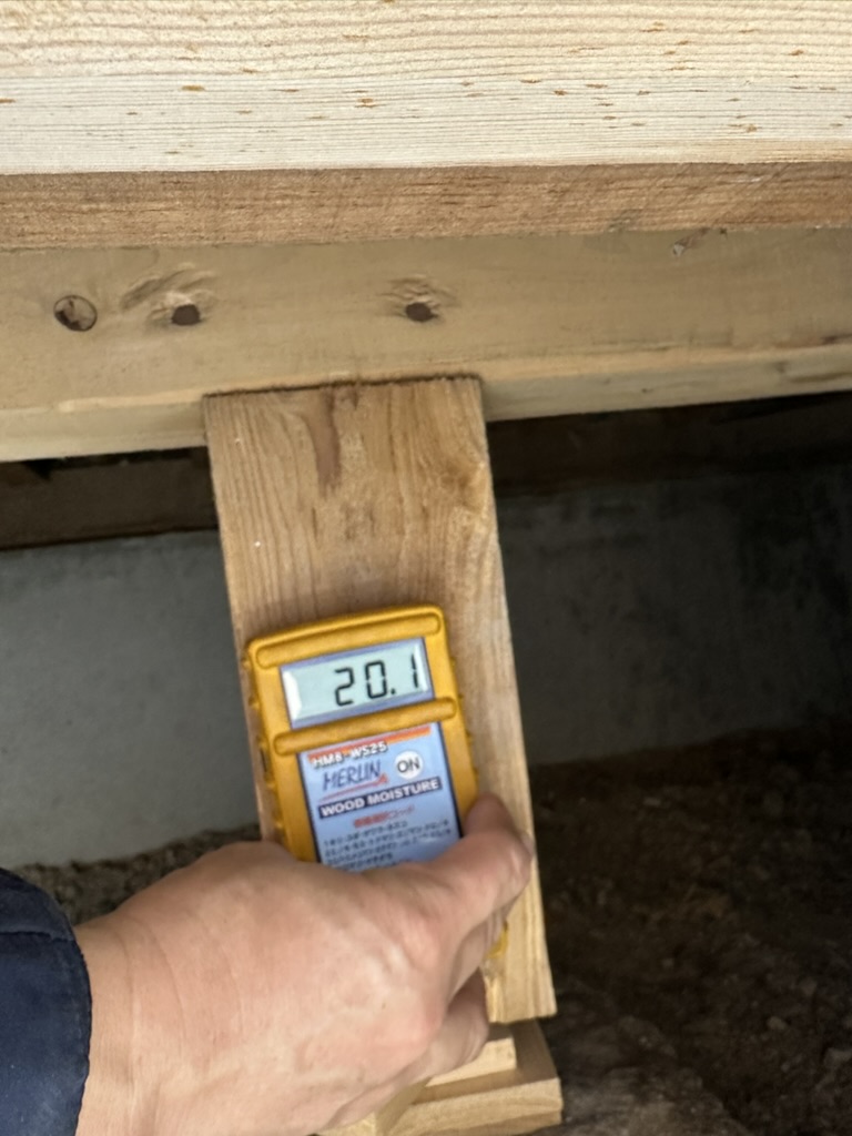 床下では、シロアリの被害がないかを目視で確認し、あわせて柱や土台の木材含水率を測定します。